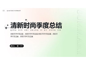 PPT模板封面,使用了绿粉渐变背景图片。左侧填写清新时尚季度总结PPT标题,设计风格为清新弥散风。