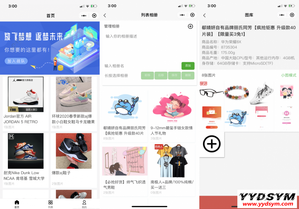 微商个人相册多端小程序源码,用于个人相册展示,适合微商,有客服联系,无需后台管理系统,小程序上直接进行管理,没有登录账号只拥有查看功能。