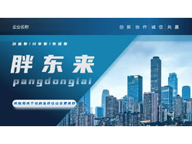 蓝色城市建筑背景的“胖东来”品牌宣讲企业介绍PPT模板下载