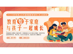 这是一套红色卡通一家人背景的“教育始于家庭与孩子一起成长”家庭教育指导工作主题培训PPT模板,共16页;