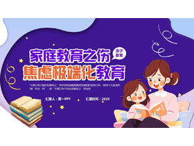 PPT模板封面,使用了卡通母女背景图片、卡通书本背景图片。左侧填写“家庭教育之伤焦虑极端化教育”PPT标题,设计风格为可爱卡通风格。
