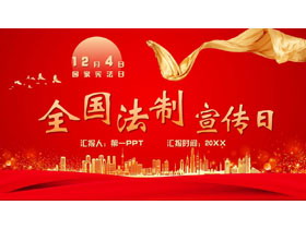 PPT模板封面,使用了红色背景,搭配城市剪影背景图片、金色绸缎背景图片。中间填写全国法制宣传日PPT标题,设计风格为大气党政风。