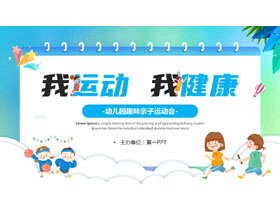 蓝色卡通风格的“我运动我健康”幼儿园趣味亲子运动会PPT模板
