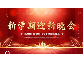 PPT模板封面,使用了红色背景,搭配人物剪影背景图片。中间填写新学期迎新晚会PPT标题,设计风格为红金大气。