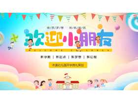 彩色卡通小朋友背景的“欢迎小朋友”幼儿园开学典礼PPT模板下载