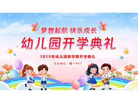 彩色卡通小朋友背景的幼儿园新学期开学典礼PPT模板下载