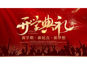 PPT模板封面,使用了红色背景,搭配人物剪影背景图片。中间填写开学典礼PPT标题,设计风格为大气励志。