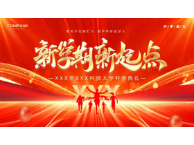 这是一套红金大气人物剪影背景的“新学期新起点”大学开学典礼PPT模板,共27页;