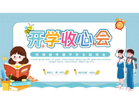 蓝色卡通风格的新学期开学收心会主题班会PPT模板下载