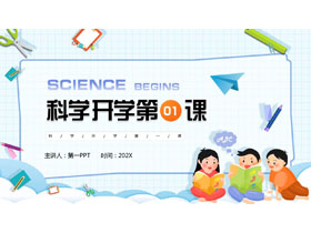 蓝色卡通小朋友背景的科学开学第一课PPT模板下载
