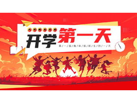 PPT模板封面,使用了插画风大学生背景图片。中间填写“开学第一天”PPT标题,设计风格为精美插画风。