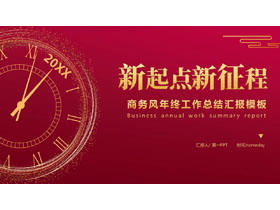 红色简约鎏金表盘背景的“新起点新征程”商务风年终工作总结汇报PPT模板下载