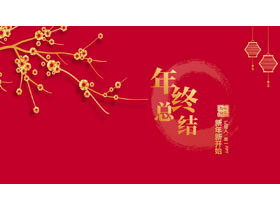 PPT模板封面,使用了红色背景,搭配鎏金梅花背景图片。右侧填写年终总结PPT标题,设计风格为鎏金中国风。