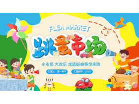PPT模板封面,使用了卡通小朋友背景图片、卡通风车背景图片。中间填写跳蚤市场PPT标题,设计风格为多彩卡通风格。