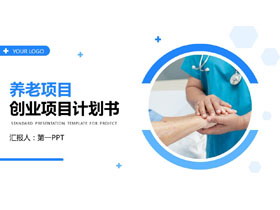 PPT模板封面,使用了医生背景图片、搭配蓝色几何图形背景图片。左侧填写养老项目创业项目计划书PPT标题,设计风格为简约商务。
