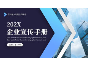 这是一套高楼大厦背景的蓝色商务风企业宣传手册PPT模板,共23页;