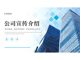 PPT模板封面,使用了高大写字楼背景图片、蓝色方块背景图片。左侧填写公司宣传介绍PPT标题,设计风格为大气商务。