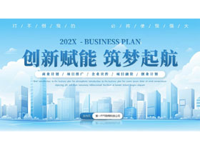 蓝色城市剪影背景的“创新赋能筑梦起航”项目商业计划书PPT模板下载