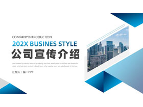 这是一套蓝色几何风城市建筑背景的公司宣传介绍PPT模板,共20页;