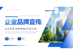 这是一套蓝色高楼大厦背景的商务风企业品牌宣传PPT模板,共24页;