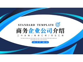 PPT模板封面,使用了蓝色曲线背景图片。中间填写商务企业公司介绍PPT标题,设计风格为商务使用。