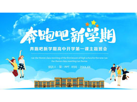 蓝色卡通风格的“奔跑吧新学期”高中开学第一课主题班会PPT模板下载