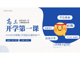 PPT模板封面,使用了蓝色色块,搭配卡通网络表情图标背景图片。左侧填写高三开学第一课PPT标题,设计风格为简约卡通风格。
