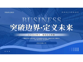 PPT模板封面,使用了蓝色背景,搭配高大写字楼背景图片。中间填写“突破边界定义未来”PPT标题,设计风格为商务实用。