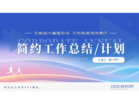 PPT模板封面,使用了动感曲线背景图片、人物剪影背景图片。中间填写简约工作总结计划PPT标题,设计风格为动感商务。