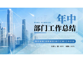 PPT模板封面,使用了蓝色背景,搭配城市建筑背景图片。右侧填写年中部门工作总结PPT标题,设计风格为商务实用。