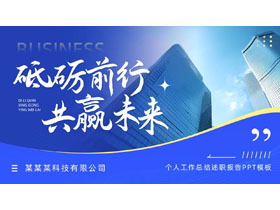 蓝色高大写字楼背景的“砥砺前行共赢未来”个人工作总结述职报告PPT模板