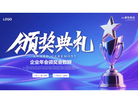 这是一套蓝紫精美奖杯背景的企业年会颁奖典礼PPT模板,共23页;