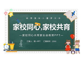 PPT模板封面,使用了绿色黑板背景图片、卡通小朋友背景图片。中间填写“家校同心家校共育”PPT标题,设计风格为卡通黑板风。