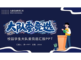 PPT模板封面,使用了蓝色底色,站在讲台演讲的学生背景图片。左侧填写大队委竞选汇报PPT标题。界面风格简洁实用。