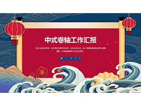 PPT模板封面,使用了翻腾浪花、红色卷轴、灯笼背景图片。中间填写工作汇报PPT标题。界面为古典中式风格。