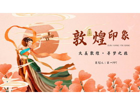 PPT模板封面,使用了飞天仙女背景图片、国潮花卉背景图片。右侧填写“敦煌印象”PPT标题,设计风格为精美国潮风。