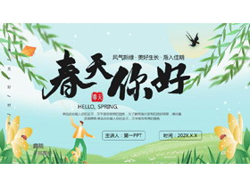 绿色清新卡通花草背景的“春天你好”春日主题商务汇报PPT模板