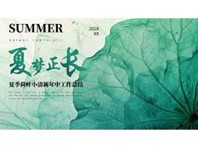 这是一套绿色“夏梦正长”夏季荷叶小清新年中工作总结PPT模板,共23页;
