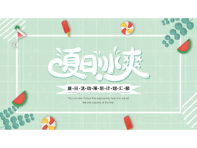 PPT模板封面,使用了卡通西瓜背景图片、卡通树叶背景图片。中间填写“夏日冰爽”PPT标题,设计风格为精美卡通风格。