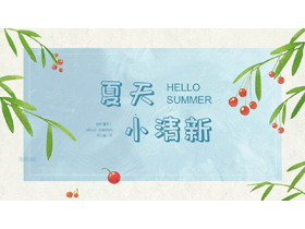 PPT模板封面,使用了卡通插画风小红果背景图片。中间填写夏天小清新PPT标题,设计风格为卡通插画风。