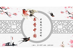 水彩花鸟背景的“书香中国”中国风工作计划PPT模板