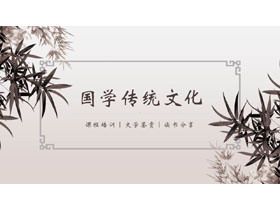 PPT模板封面,使用了水墨树叶背景图片。中间填写国学传统文化PPT标题,设计风格为古典中国风。