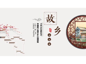 PPT模板封面,使用了古典窗棂背景图片、古典白墙背景图片。中间填写“故乡”PPT标题,设计风格为古典中国风。