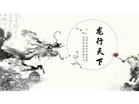 PPT模板封面,使用了水墨中国龙背景图片、水墨庭院背景图片。右侧填写“龙行天下”PPT标题,设计风格为水墨中国风。
