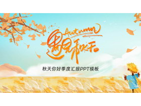 这是一套金色芦苇银杏叶搭配草人背景“遇见秋天”季度汇报PPT模板,共20页;