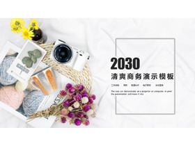 PPT模板封面,使用了相机相片、花卉背景图片。右侧填写商务演示PPT标题。界面为清爽商务风格。