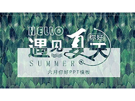 PPT模板封面,使用了绿色一片片的树叶背景图片。左间填写六月你好——遇见夏天PPT标题。界面风格绿色清新。