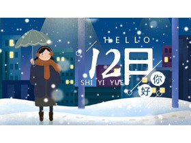 PPT模板封面,使用了深蓝色城市背景,白色雪花,和身穿冬装打伞的女孩背景图片。右侧放置12月你好PPT艺术字标题。界面风格卡通有趣。