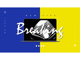 PPT模板封面,使用了蓝黄撞色背景、笔记本电脑背景图片。中间填写商务汇报PPT标题。界面风格为简约欧美风。