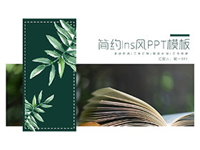 PPT模板封面,使用了清新绿色水彩叶子、翻开的书籍背景图片。右侧填写Ins风PPT标题。界面风格简约清新。